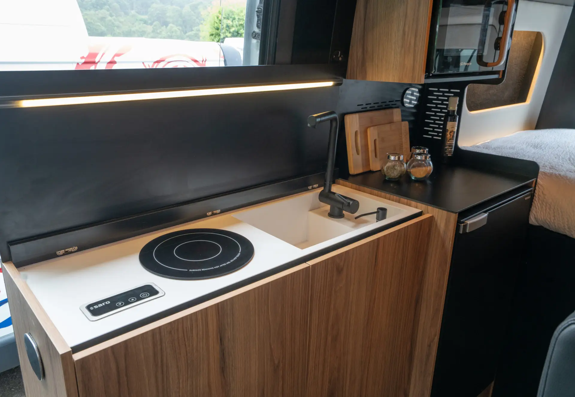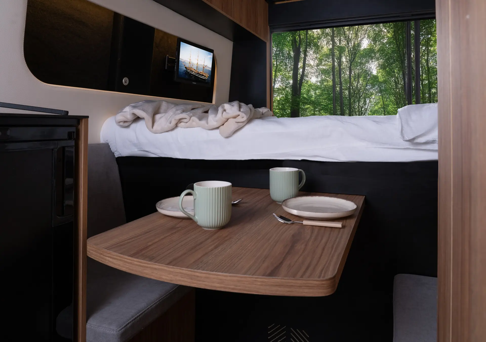 Compacta y ágil, ideal para escapadas rápidas por la Costa Brava. Capacidad hasta 3 personas, con cama doble, cocina equipada con nevera y fogón, y un espacio de almacenamiento sorprendentemente amplio. Perfecta para parejas o pequeños grupos que buscan libertad y comodidad en cada viaje.